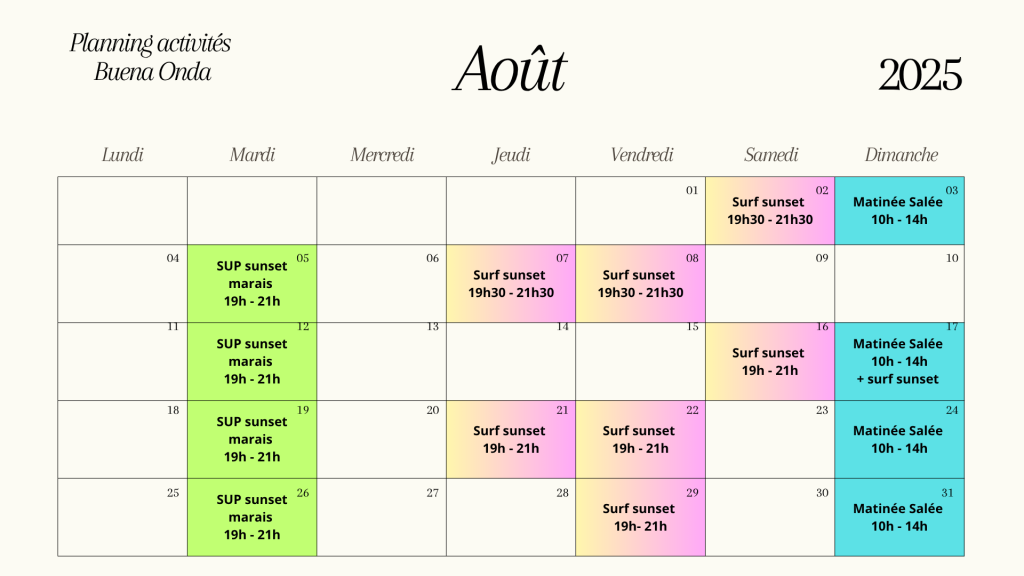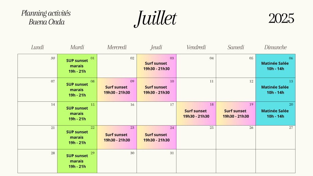 Calendrier des activités de l'été Pour toute demande de réservation, merci de nous envoyer un message ou un e-mail en précisant l’activité choisie et votre nom/prénom.Vous trouverez les contacts en bas de la page. Au plaisir de vous lire.